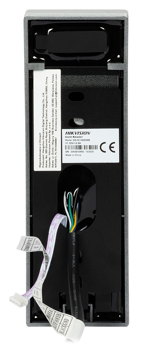 DS-K1105EMB to zewnętrzny czytnik RFID, który obsługuje tagi Mifare 13,56 MHz oraz Unique/EM 125 kHz.